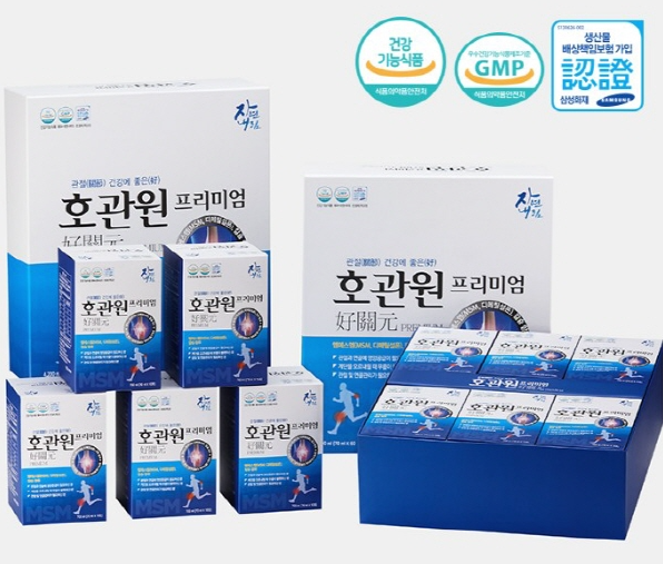 건강기능식품 호관원 프리미엄은 관절 건강에 필요한 성분에 집중한 제품인 만큼 MSM이 2포기준 1500mg 함유돼 있으며 이밖에도 생리 활성 기능 2등급인 보스웰리아, 녹용, 버드나무 추출물 등 혈액순환 증진과 근육통 완화에 도움이 되는 한약재가 들어있는 것이 특징입니다.
